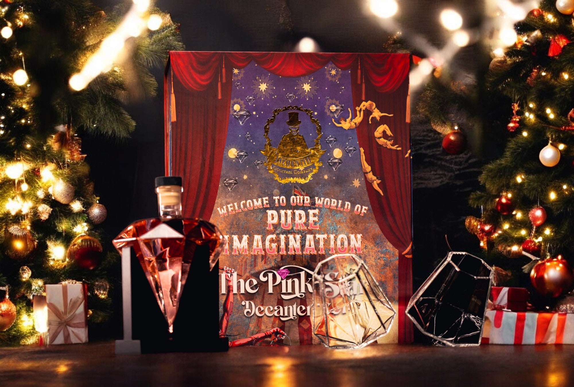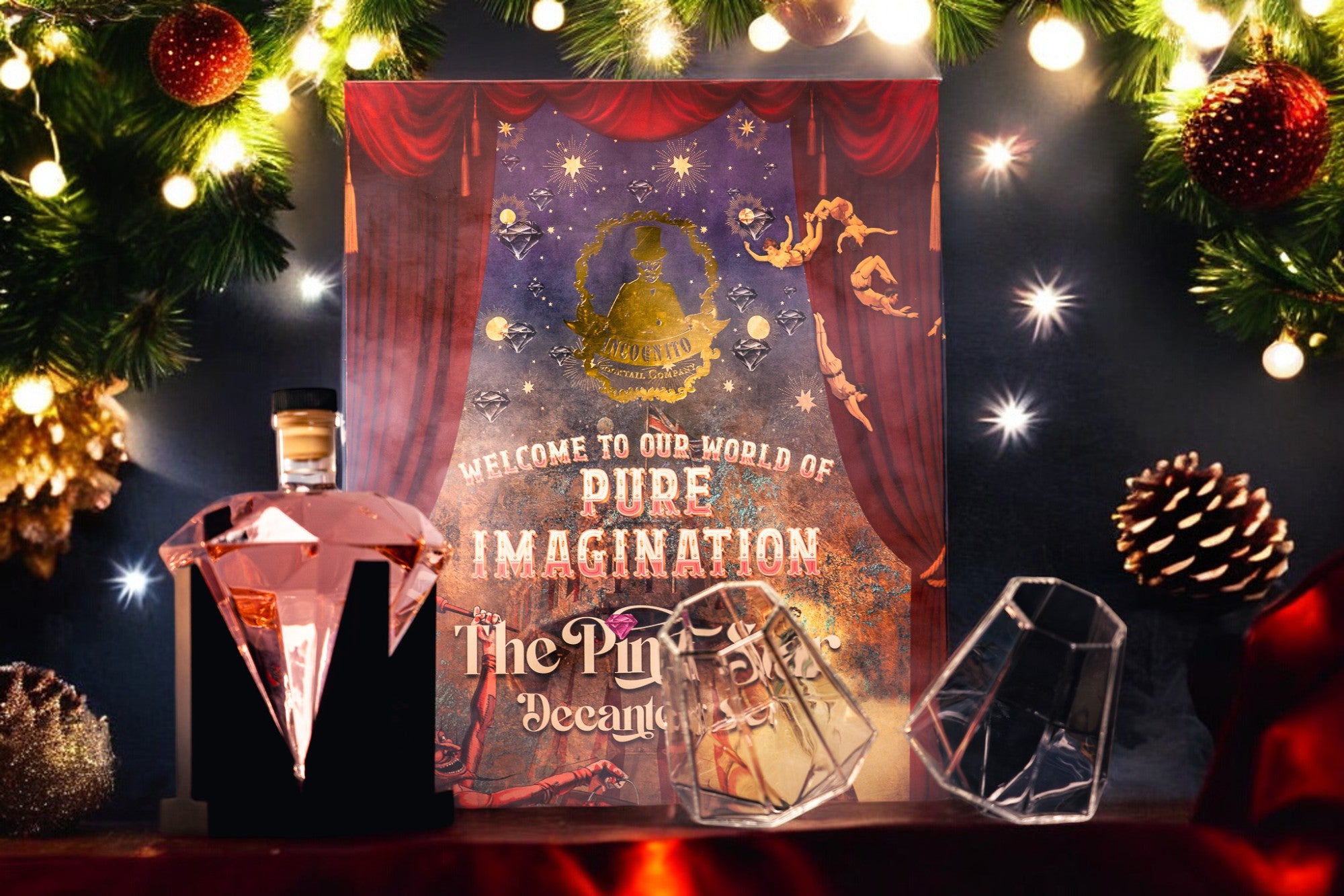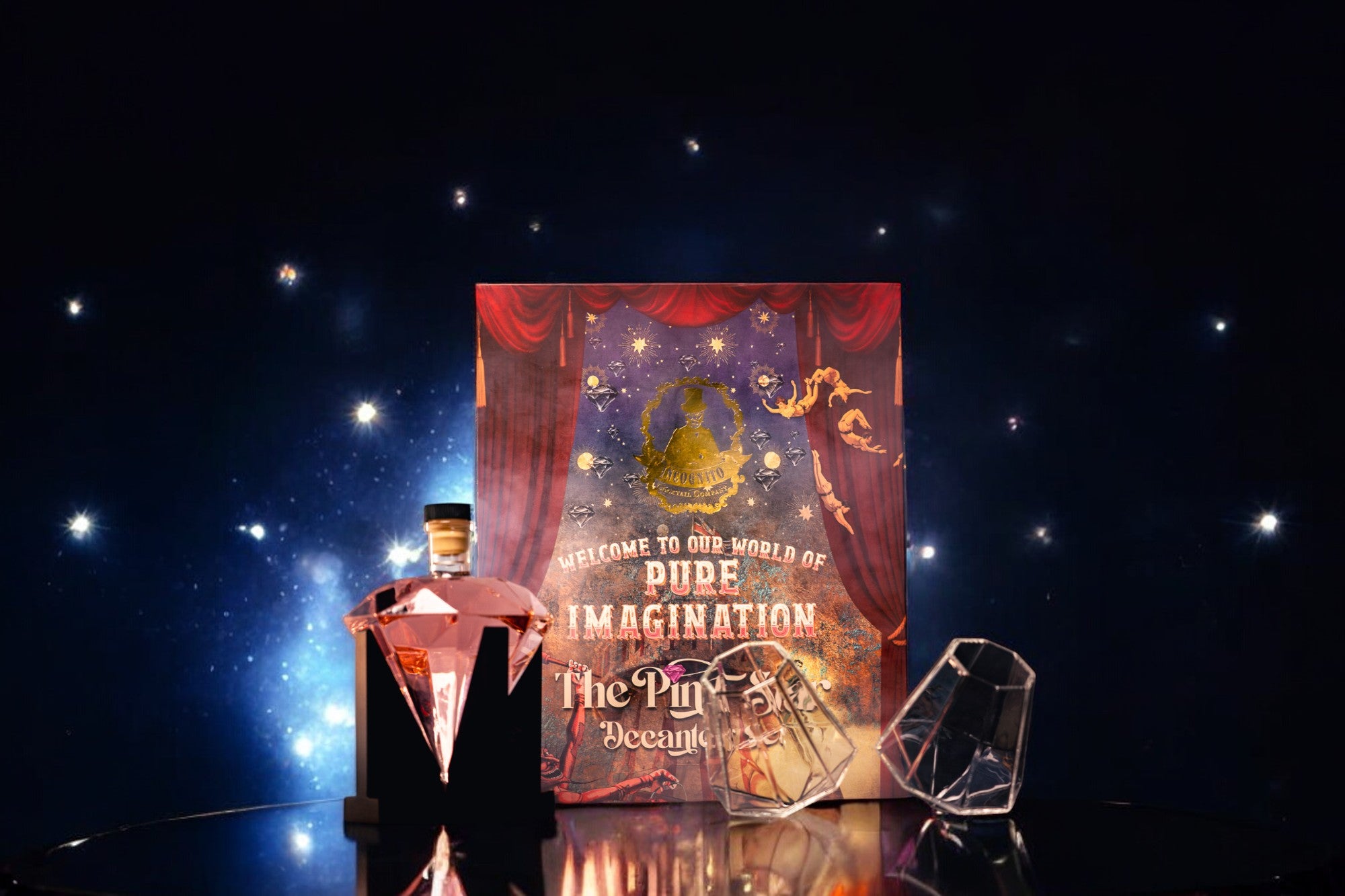 Pink Star Diamond Decanter set complete with 500ml Strawberry & Raspberry Gin and two diamond shaped glasses presented in a luxury gift box with ribbon tie.